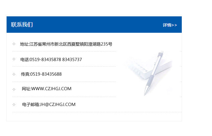 傳真:0519-83435688    郵編:213135    網址:WWW.czjhgj_com.kpodin.com    電子郵箱:JH@czjhgj_com.kpodin.com